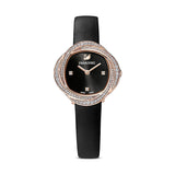 This Swarovski watch displays a brilliant integration of natural forms and modern design. Inspired by flowers, the bezel features two intertwined rows of bright crystals on rose gold-tone PVD coating. Nestled among these sparkling lines sits a black sunray dial adorned with crystal index markers and the Swarovski logo at 12 o'clock. A black, Italian calf-skin leather strap adds the finishing touch to this Swiss Made watch. Dress up your style with this floral timepiece to add extraordinary romance to your every day.