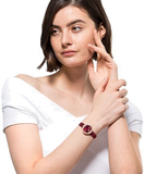 This Swarovski watch displays a brilliant integration of natural forms and modern design. Inspired by flowers, the bezel features two intertwined rows of bright crystals on rose-gold tone PVD coating. Nestled among these sparkling lines sits a ruby-tone coloured sunray dial adorned with crystal index markers and the Swarovski logo at 12 o'clock. A ruby, genuine leather strap adds the finishing touch to this Swiss Made watch. Dress up your style with this floral timepiece to add extraordinary romance to your every day.