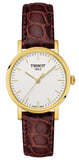 Yellow gold PVD stainless steel case with a brown (croco-embossed) leather strap. Fixed yellow gold PVD bezel. White dial with yellow gold-tone hands and index hour markers. Minute markers around the outer rim. Dial Type: Analog. ETA Caliber 902.101 quartz movement. Scratch resistant sapphire crystal. Pull / push crown. Solid case back. Case size: 30 mm. Case thickness: 6.15 mm. Round case shape. Band width: 15 mm. Tang clasp. Water resistant at 30 meters / 100 feet. Functions: hour, minute, second. Dress watch style. Watch label: Swiss Made. Tissot Everytime White Dial Ladies Watch T109.210.36.031.00.
