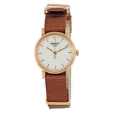 Rose gold PVD stainless steel case with a brown nylon strap. Fixed rose gold PVD bezel. White dial with rose gold-tone hands and index hour markers. Minute markers around the outer rim. Dial Type: Analog. Quartz movement. Scratch resistant sapphire crystal. Pull / push crown. Solid case back. Case size: 30 mm. Case thickness: 6.15 mm. Round case shape. Tang clasp. Water resistant at 30 meters / 100 feet. Functions: hour, minute, second. Casual watch style. Tissot Everytime White Dial Ladies Watch T1092103703100.