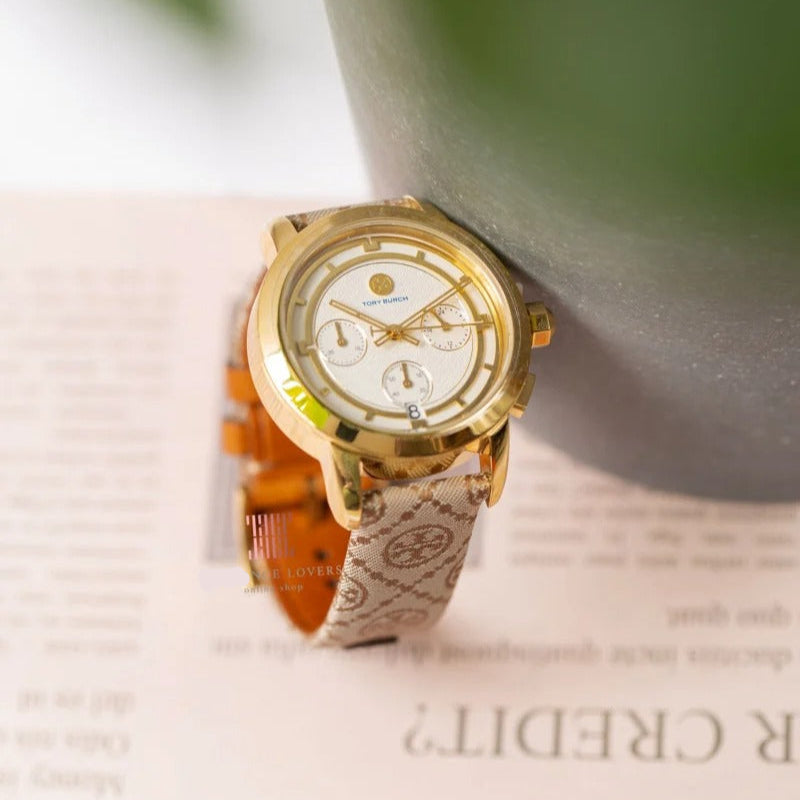 Tory Burch's The Tory watch features a cream glossy dial, chronograph movement, and a hazelnut jacquard strap with leather trim.