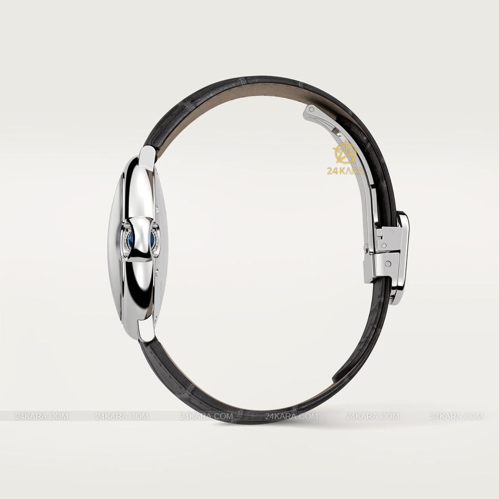 Ballon Bleu de Cartier watch, 36 mm, mechanical movement with automatic winding. Case in steel, fluted crown set with a synthetic cabochon-shaped spinel. Silvered guilloché opaline dial. Blued-steel sword-shaped hands. Sapphire crystal. Black alligator-skin strap, interchangeable steel folding buckle. Case thickness: 12.1 mm. Water-resistant to 3 bar (approx. 30 metres).