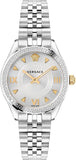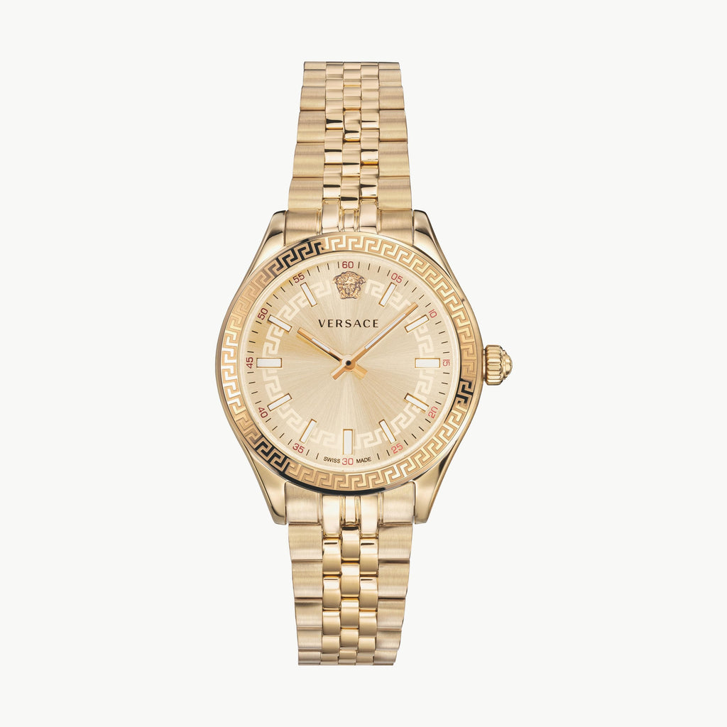 Elevate your style with the Versace Virtus Quartz watch, featuring a radiant gold dial paired with a sleek gold steel strap. Crafted for women who appreciate luxury and precision, this timepiece blends bold elegance with reliable quartz movement. Its distinctive design effortlessly complements both casual and formal looks, making it a versatile addition to your collection. Experience timeless sophistication and standout beauty with this exquisite Versace watch.