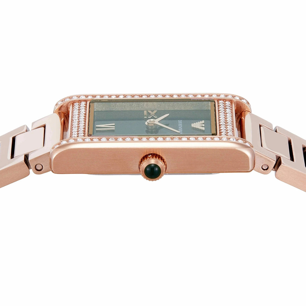 Emporio Armani's 22mm x 32mm watch features a dark green glossy dial, two-hand movement and rose gold-tone stainless steel bracelet.