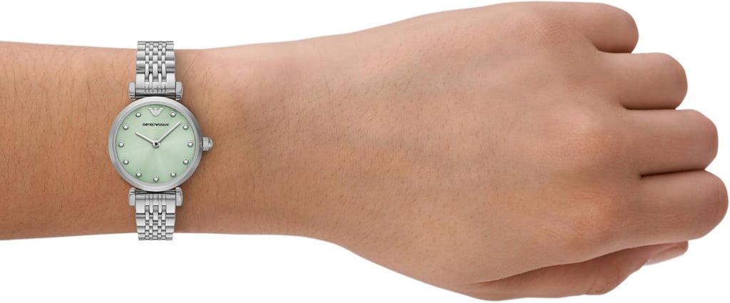 The Emporio Armani AR11667 ladies watch features a sophisticated green dial complemented by two-hand movement, offering clear and precise timekeeping. Its sleek design merges elegance with functionality, making it an ideal accessory for a refined, everyday look.