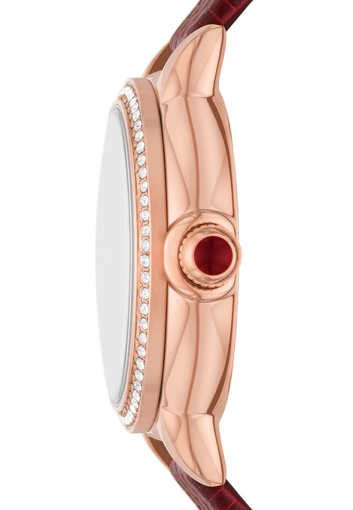 Armani 3-hand women's watch. Quartz movement watch with round stainless steel case and polished rose gold finish. Size: 32 mm. Thickness: 8 mm. The dial is white and the glass is transparent. Crystals on the bezel. The strap is a pro-planet leather strap with red pro-planet leather finish and with a pin buckle closure. Lug distance: 12 mm. Water resistance: 5 atm. The reference is AR11646