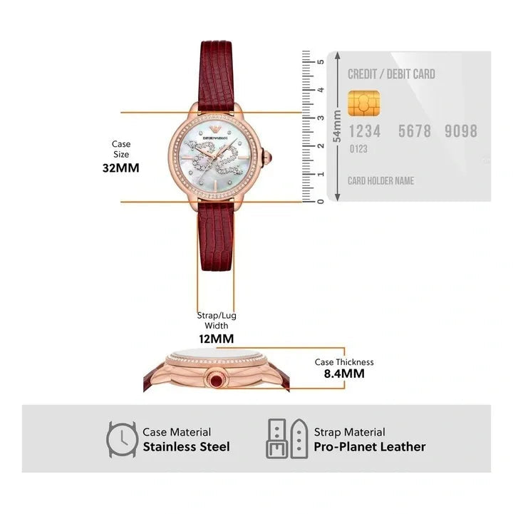 Emporio Armani's 32mm watch features a white mother-of-pearl dial with a snake motif in crystal stones, three-hand movement, and a red lizard texture leather strap.