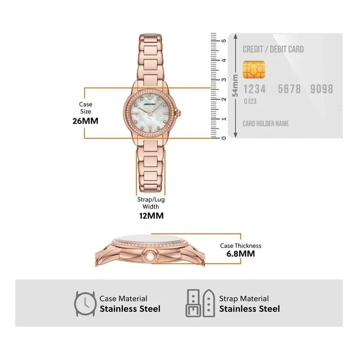 Emporio Armani's 26mm petite stainless steel watch showcases a glossy white mother-of-pearl dial in a round case with a two-hand quartz movement. The sleek rose gold-tone stainless steel bracelet makes this a beautiful addition to an ensemble for any occasion.