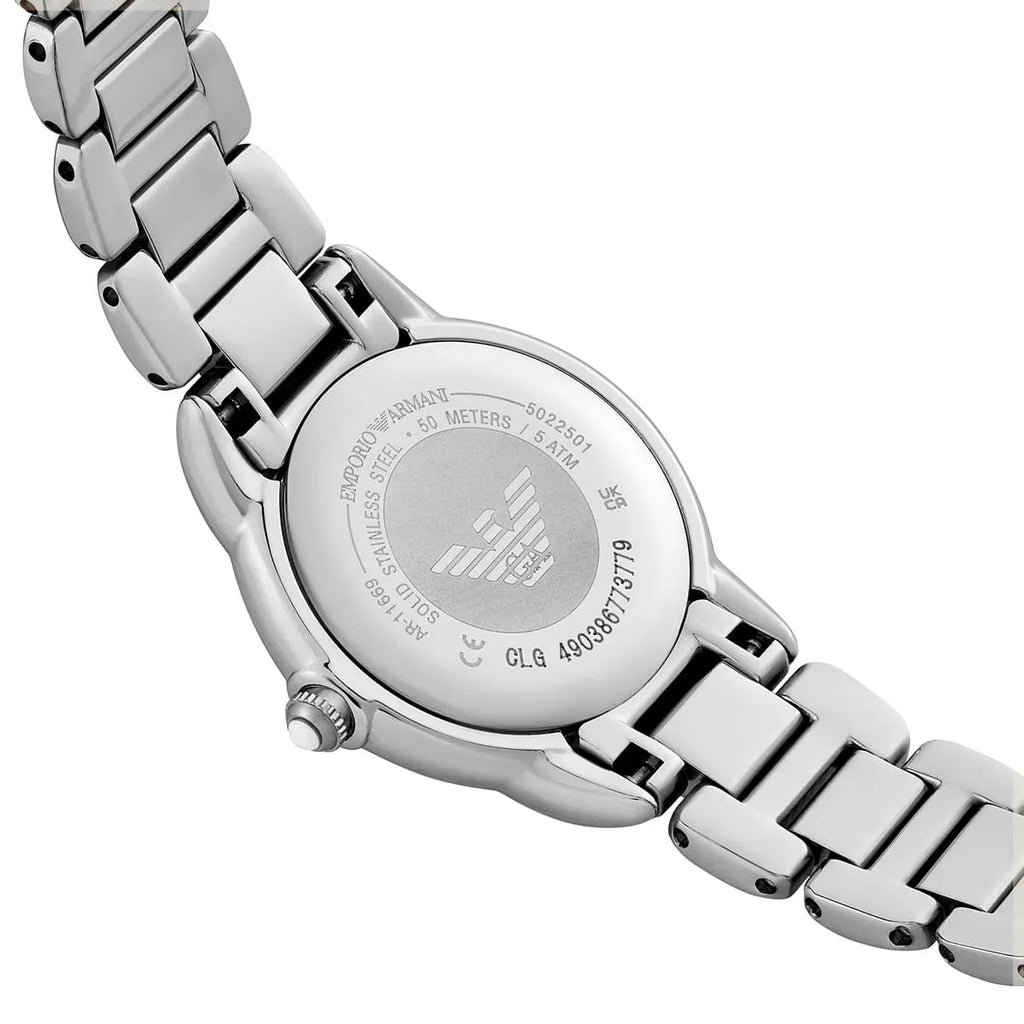 The case of the Emporio Armani STAINLESS STEEL AR11669 is made from high-quality stainless steel, ensuring durability and a polished finish that catches the eye. Measuring a compact 12 mm in diameter, the round case is perfectly proportioned for a feminine wrist, making it an ideal accessory for both casual and formal occasions. The strap, also crafted from stainless steel, features a width of 26 mm and comes in a striking silver color that complements the case beautifully. This harmonious color palette, combined with the pristine white face, creates a watch that radiates elegance and sophistication.
