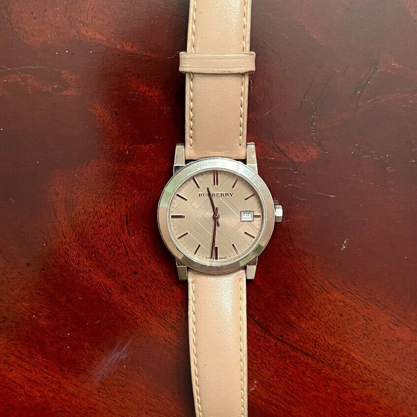 This Burberry wristwatch comes crafted in stainless steel. The rounded case holds a bezel housing a dial embossed with a checkered pattern. It features silver-tone hour index markers, slim hands and a date window at 3 o'clock. It comes with a leather bracelet with perceptible stitching and buckle closure.Gender Women