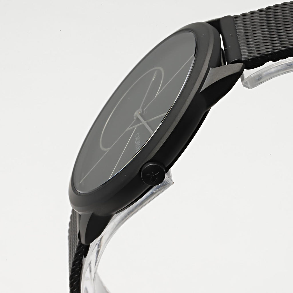 Black dial enhanced by silver-tone hands. Black PVD stainless steel case with a black pvd stainless steel mesh band. Quartz movement. 30 meters / 100 feet water resistance. Fixed bezel. Scratch Resistant Mineral crystal. Solid caseback. Fold Over Slip Through clasp. Pull / Push crown. Case size 40 mm x 7 mm. Band 20 mm x long. Calvin Klein K3M5145X Minimal Watch.