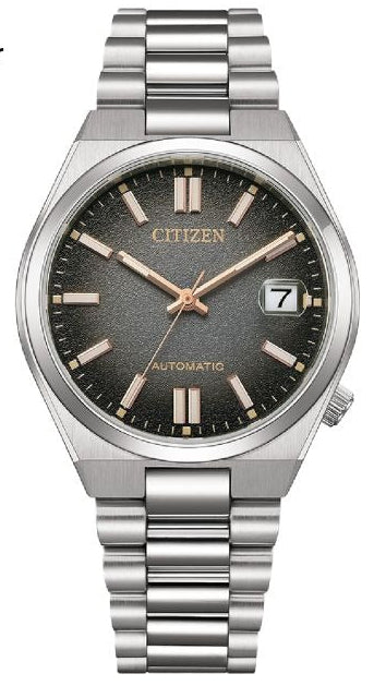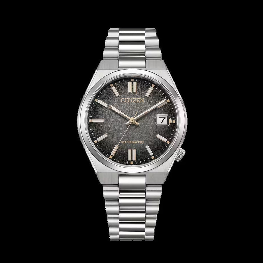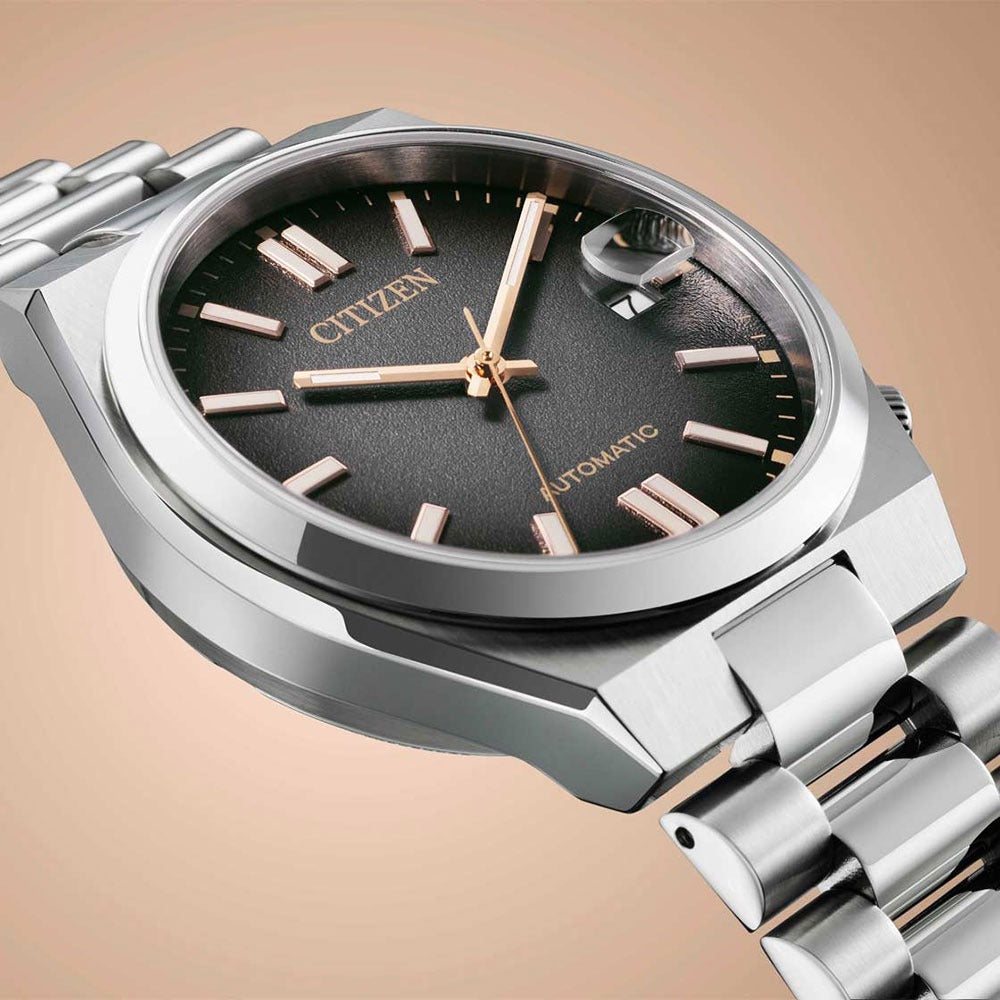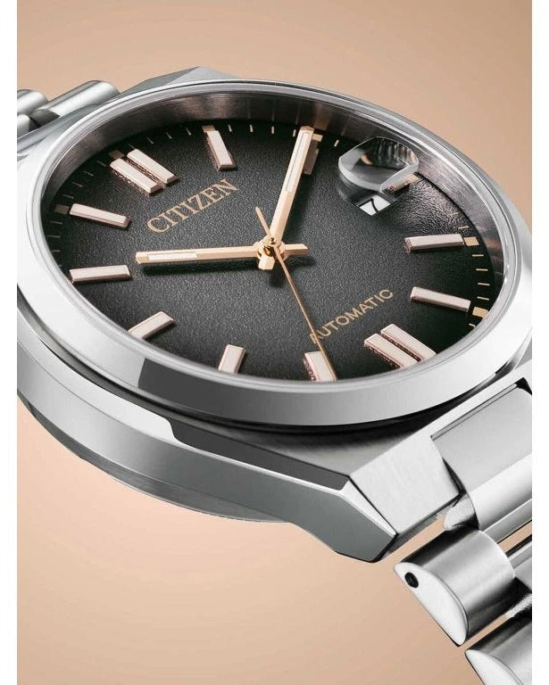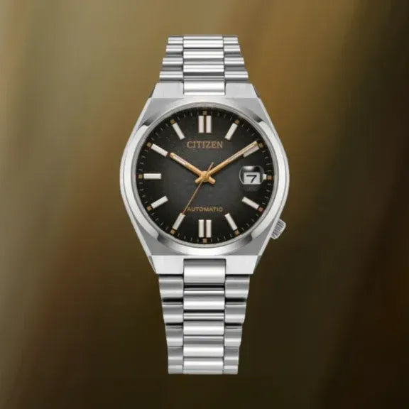 The Citizen NJ0200-50E Tsuyosa Limited Edition is a stylish automatic watch with a compact diameter of 37 mm. This limited edition of only 8,000 pieces worldwide immediately stands out thanks to its fumé dial (a fumé dial is a type of dial that has a colour gradient, usually from dark at the edges to lighter in the centre) that elegantly transitions from black to grey. The gold-coloured accents give this watch a luxurious look, while the comfortable fit and slim profile make it perfect for everyday use.