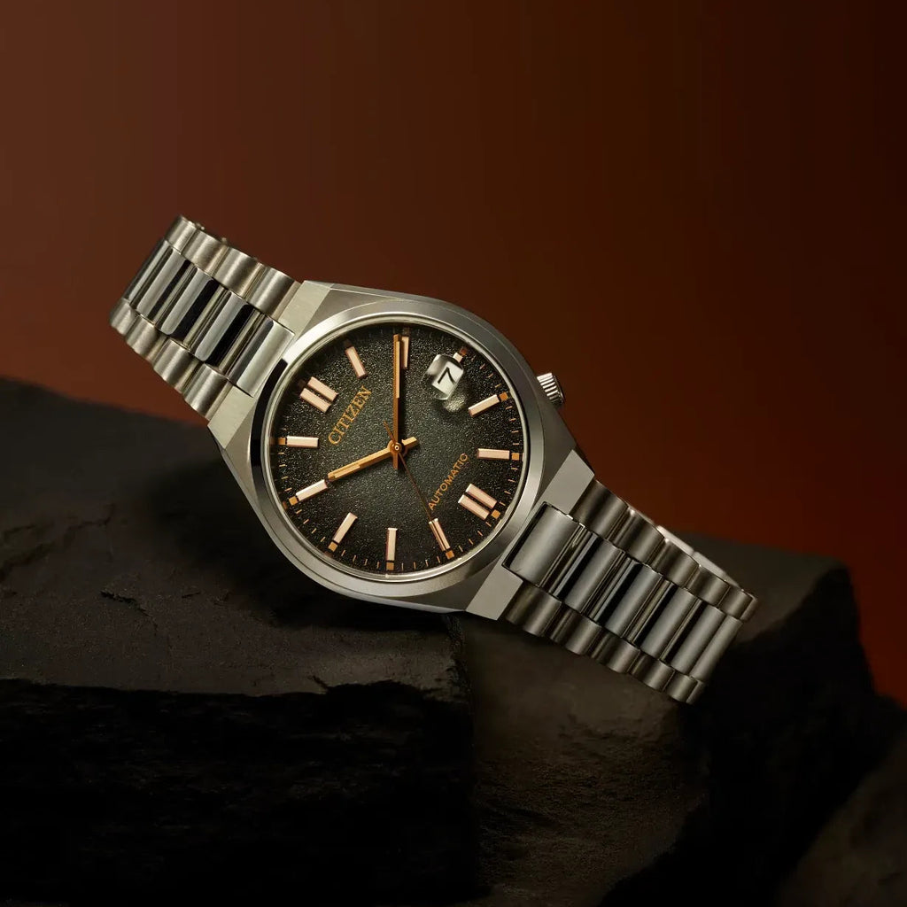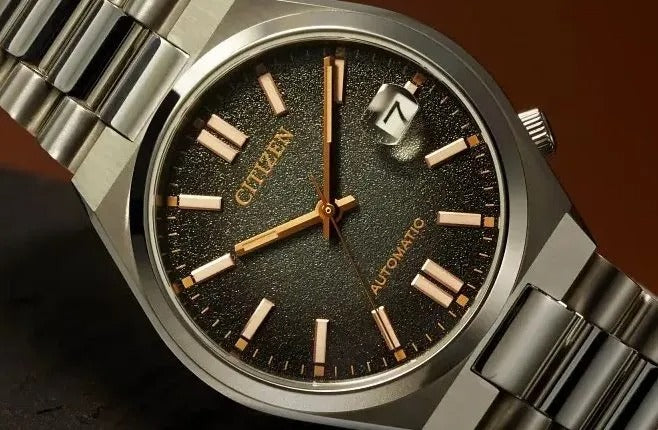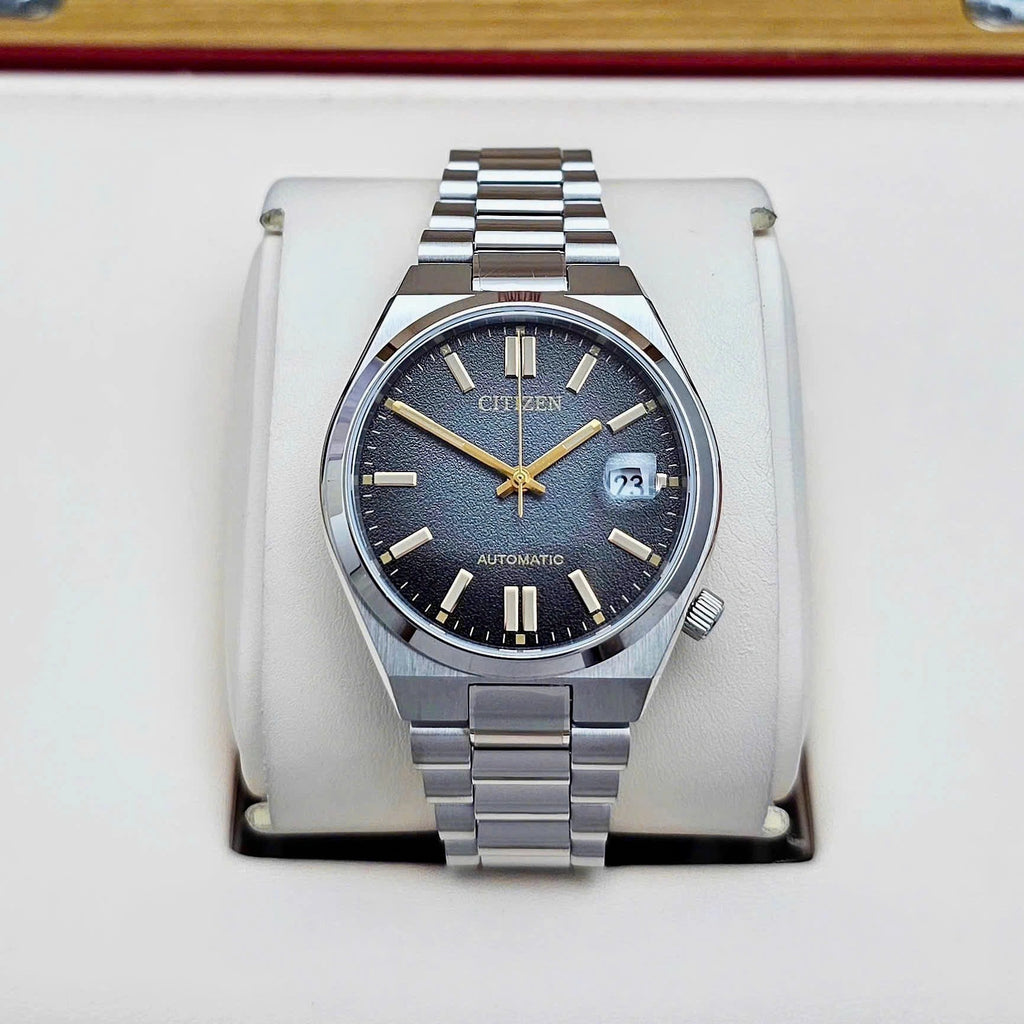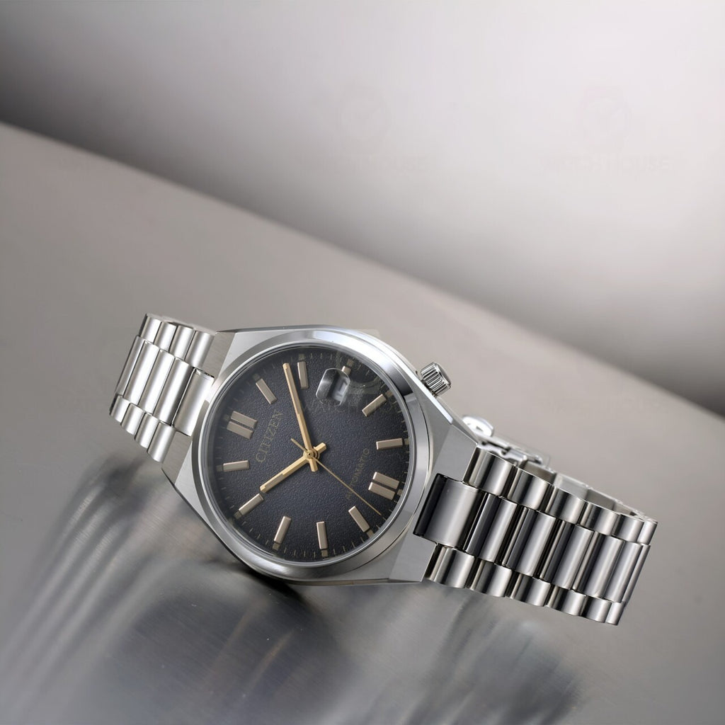 The Citizen NJ0200-50E Tsuyosa Limited Edition is a stylish automatic watch with a compact diameter of 37 mm. This limited edition of only 8,000 pieces worldwide immediately stands out thanks to its fumé dial (a fumé dial is a type of dial that has a colour gradient, usually from dark at the edges to lighter in the centre) that elegantly transitions from black to grey. The gold-coloured accents give this watch a luxurious look, while the comfortable fit and slim profile make it perfect for everyday use.
