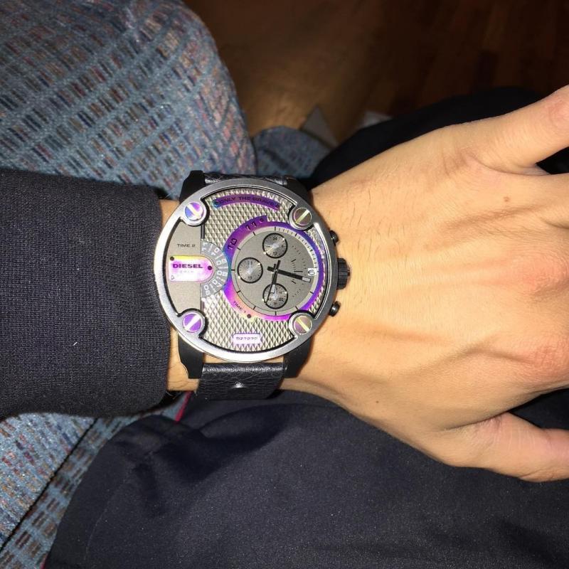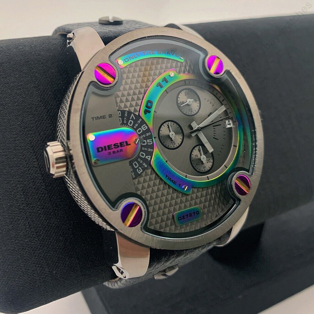 Stainless steel case with a black (calfskin) leather strap. Fixed stainless steel bezel. Grey and rainbow dial with luminous blue hands and index hour markers. Second-time zone on rotating disk. Dial Type: Analog. Luminescent hands and markers. Date display at the 3 o'clock position. Chronograph - three sub-dials displaying: 60 seconds, 30 minutes, and 24 hours. Quartz movement. Scratch-resistant mineral crystal. Pull/push crown. Solid case back. Case diameter: 52 mm. Case thickness: 13 mm. Oval case shape. Band width: 24 mm. Band length: 8.5 inches. Tang clasp. Water-resistant at 50 meters / 165 feet. Functions: chronograph, date, hour, minute, second. Casual watch style. Diesel Bass Ass Chronograph Grey and Rainbow Dial Stainless Steel Men's Watch DZ7270.