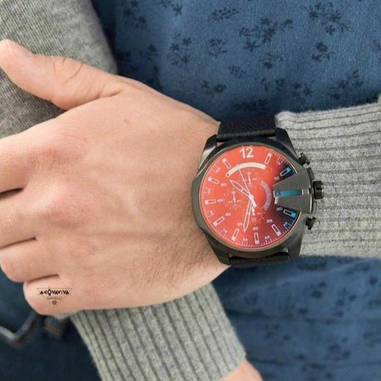 Elevate your style with the Diesel Mega Chief Chronograph Watch for Men. This sleek black timepiece features a bold black leather strap and a striking black dial. The chronograph function adds practicality and edge to the design. Upgrade your wrist game with this must-have accessory for the modern man!