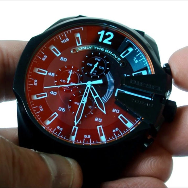 - Industrial-Look watch in onyx-tone finish featuring large round dial with chronograph functionality and extended crown casing