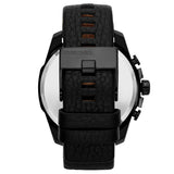 This Diesel Mega Chief DZ4291 comes in black ion-plated stainless steel case with a black leather strap. Fixed black ion-plated bezel. Black dial with orange and black hands and index and Arabic numeral hour markers. Arabic numeral marks the 12 o'clock position. Minute markers around the outer rim.