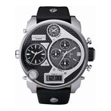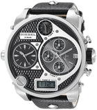 Stainless steel case with a black leather strap. Fixed stainless steel bezel. Black - three tome zone dial with silver-tone hands. Dial Type: Analog-digital. Luminescent digital time zone display. Date displays at the 3 o'clock position. Chronograph - three sub-dials displaying: 60 second, 60 minute and 1/10th of a second. Quartz movement. Scratch resistant mineral crystal. Solid case back. Case diameter: 65 mm x 57 mm. Round case shape. Band width: 28 mm. Tang clasp. Water resistant at 50 meters/ 165 feel. Functions: hour/ minute/ second/ 4 time zones. Sport watch style. Diesel Chronograph Men's Watch DZ7125.