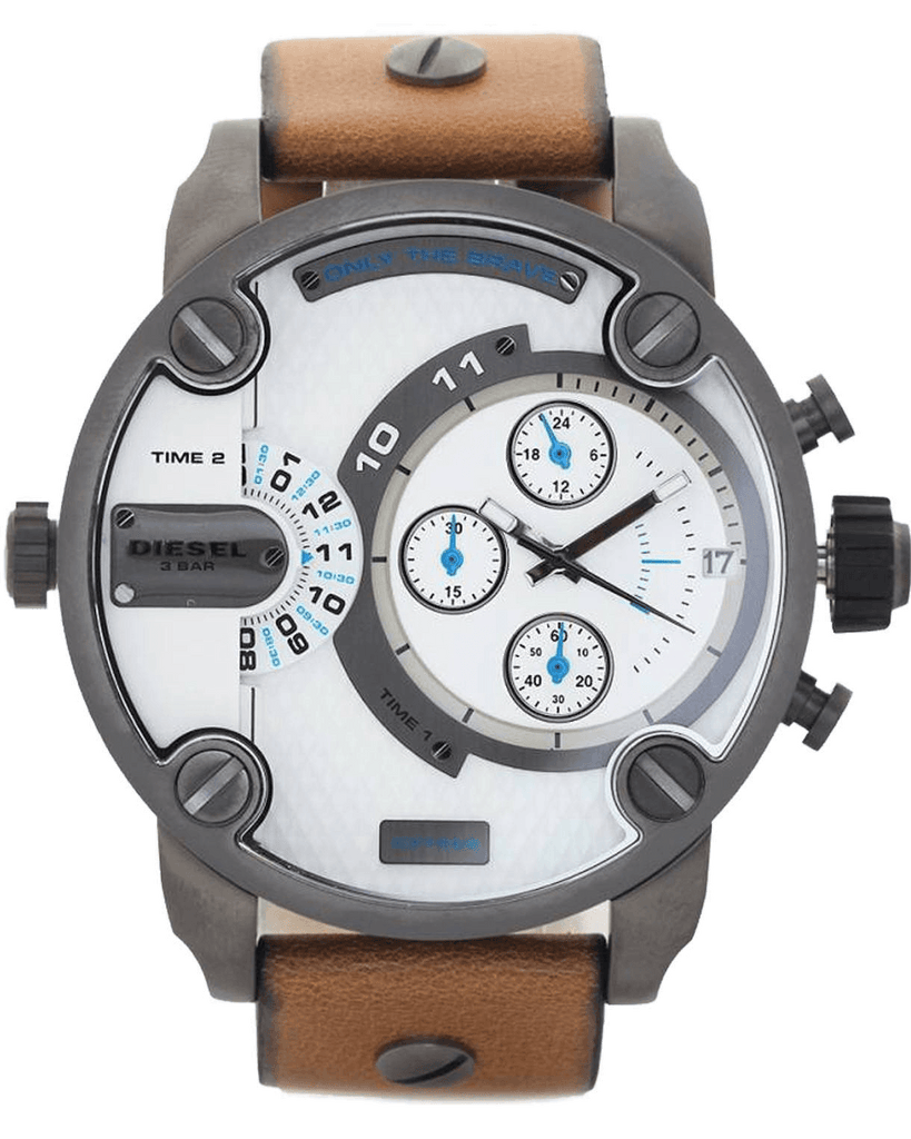 Diesel SBA Dual Time Chronograph White Dial Brown Leather Strap Watch For Men - DZ7269