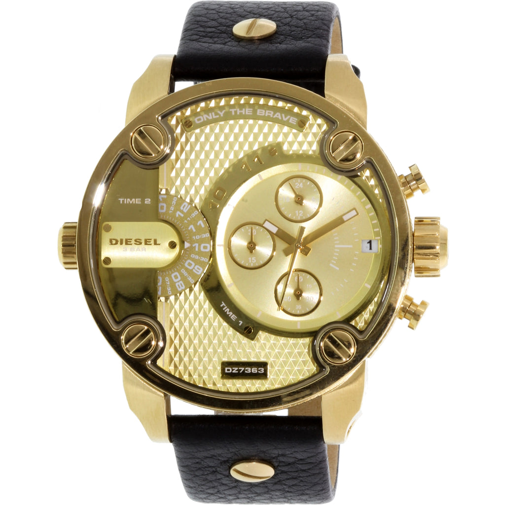 This Diesel Mr Daddy DZ7363 Dual Zone Men's watch comes with a gold-tone stainless steel case with a black leather strap. Fixed gold-tone bezel. Champagne dial with gold-tone hands and index hour markers. Scratch resistant mineral crystal. Solid case back. Case dimensions: 51 mm x 61 mm. Case thickness: 13 mm. Band width: 24 mm. Tang clasp. Water resistant at 30 meters / 100 feet.