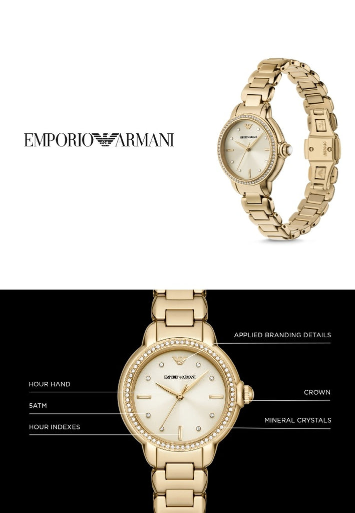 Emporio Armani's 32mm watch features an eggshell sunray dial, three-hand movement and gold-tone stainless steel bracelet. This wristwatch from Armani Exchange is crafted for the moments that matter most. The watch dial is protected with mineral glass and is water resistant up to 50 m. The timepiece works on a quartz movement.