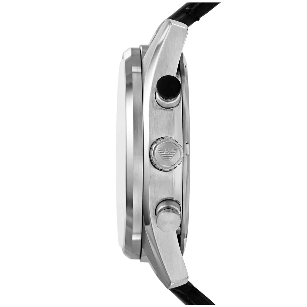 Elevate your style with the Emporio Armani Racer Chronograph, featuring a sleek black dial complemented by a black leather strap. This men's watch combines precise chronograph functionality with elegant design, perfect for both everyday wear and special occasions. Durable and comfortable, it ensures you stay punctual with sophistication and a modern edge.