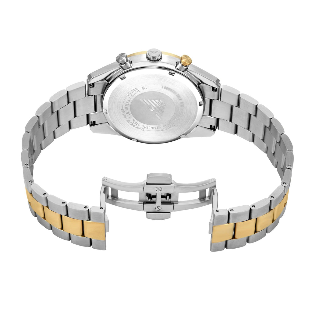 Crafted for the modern man, the Emporio Armani Chronograph AR11678 is a refined men's watch that blends bold design with timeless elegance. Its 42mm stainless steel case houses a striking black dial with white sub dials, offering sharp contrast and elevated readability. The brushed silver and gold-tone bracelet adds a luxurious finish, combining warm and cool metals for a sophisticated edge.