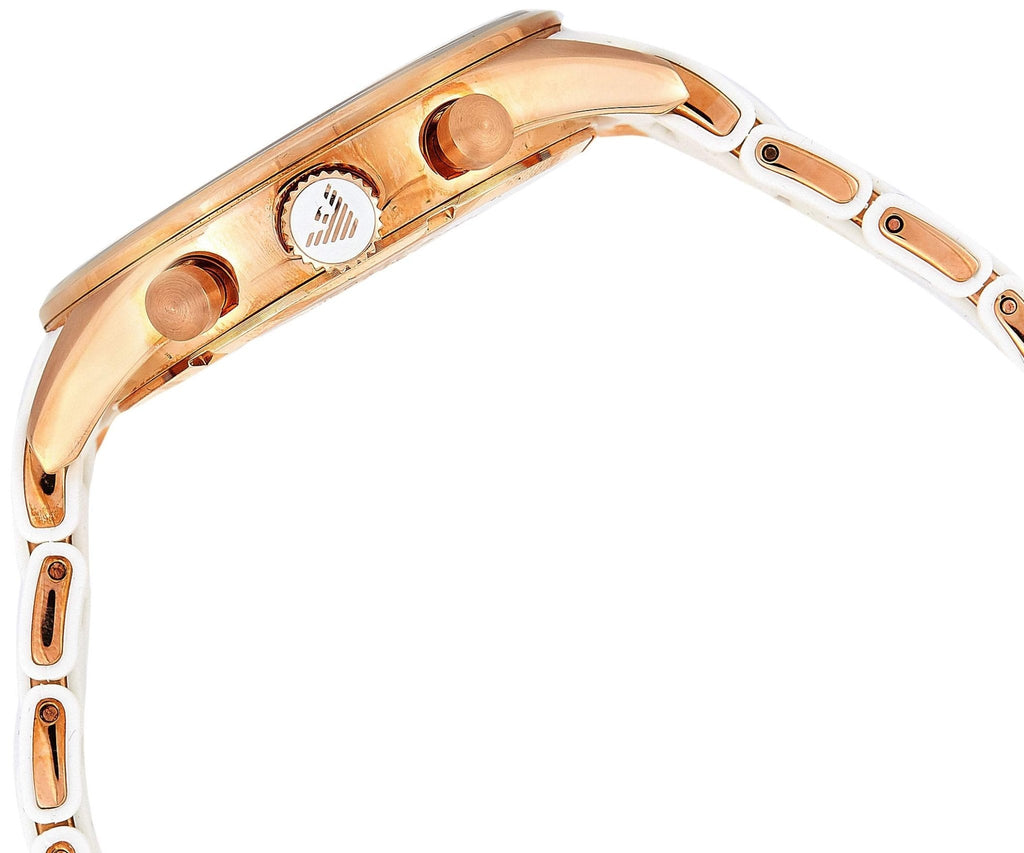 Scratch resistant mineral crystal. Textured rose gold-tone crown. Screw down case back. Case diameter: 43 mm. Deployment clasp. Water resistant at 50 meters / 165 feet. Emporio Armani Sport Collection Chronograph White Men's Watch AR5919.