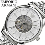 Stainless steel case with a stainless steel bracelet. Fixed stainless steel bezel. Silver (skeleton center) dial with silver-tone skeleton hands and index hour markers. Minute markers around the outer rim. The Emporio Armani logo appears at the 12 o'clock position. Dial Type: Analog.