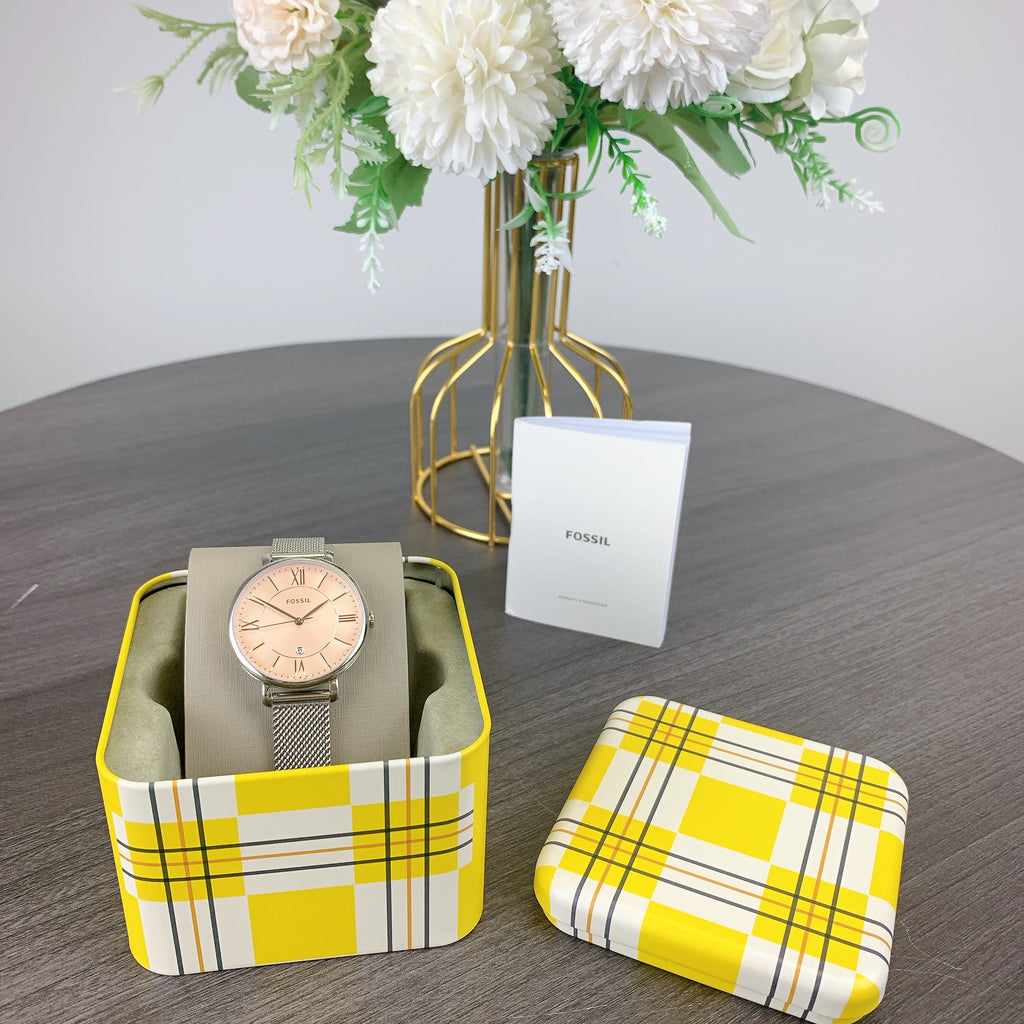 Fossil Jacqueline Three Hand Pink Dial Silver Mesh Strap Watch for Women - ES5089
