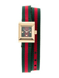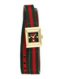Gucci G Frame Yellow gold PVD stainless steel case with a red and green striped canvas strap. Fixed yellow gold PVD bezel. Red and green dial with yellow gold-tone hands. Pyramid markers at the 3, 6 and 9 o'clock positions. Dial Type: Analog. Quartz movement. Scratch resistant sapphire crystal. Square case shape. Case dimensions: 18 mm x 14 mm. Water resistant at 30 meters.