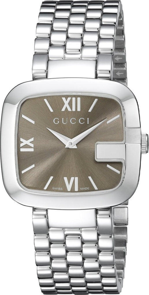 stainless steel case, with a brown dial. Silver stainless steel Bracelet. quartz movement. sapphire crystal. 32mmx 32mmx 9mm case. 11mm band width. 30 meters water resistant. Gucci G-Gucci Quartz Stainless Steel Watch YA125413