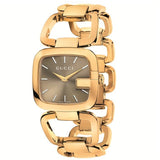 Yellow gold-tone stainless steel case and bangle bracelet. Fixed G-shaped yellow gold-tone bezel. Brown sun brushed dial with gold-tone hands and index hour markers. The Gucci name appears below the 12 o'clock position. Dial Type: Analog. Quartz movement. Scratch resistant sapphire crystal. Pull / push crown.