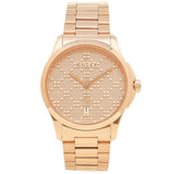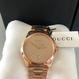 This incredible Gucci G-Timeless Pink Gold Dial Stainless Steel Unisex Watch YA126482 features a 38 mm pink gold tone stainless steel case with a pink gold diamond-patterned dial with a scratch resistant sapphire crystal. It also includes pink gold tone hands and no markers.