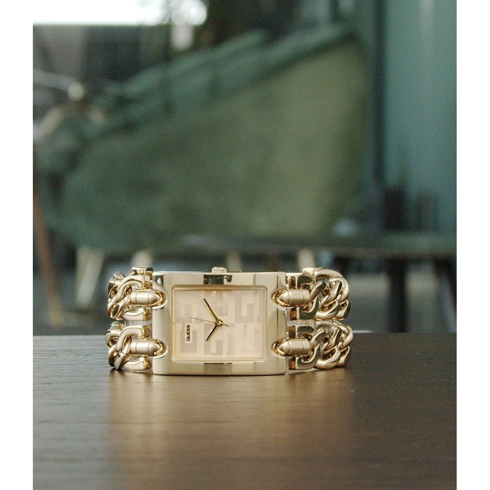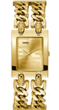 Guess women's analog watch from the mod g collection. Watch with 36 mm case in polished steel gold finish. The steel dial with tone-on-tone Guess logo. Double chain bracelet in polished steel gold finish with g-link closure. The water resistance is 10 meters. The reference is gw0294l2