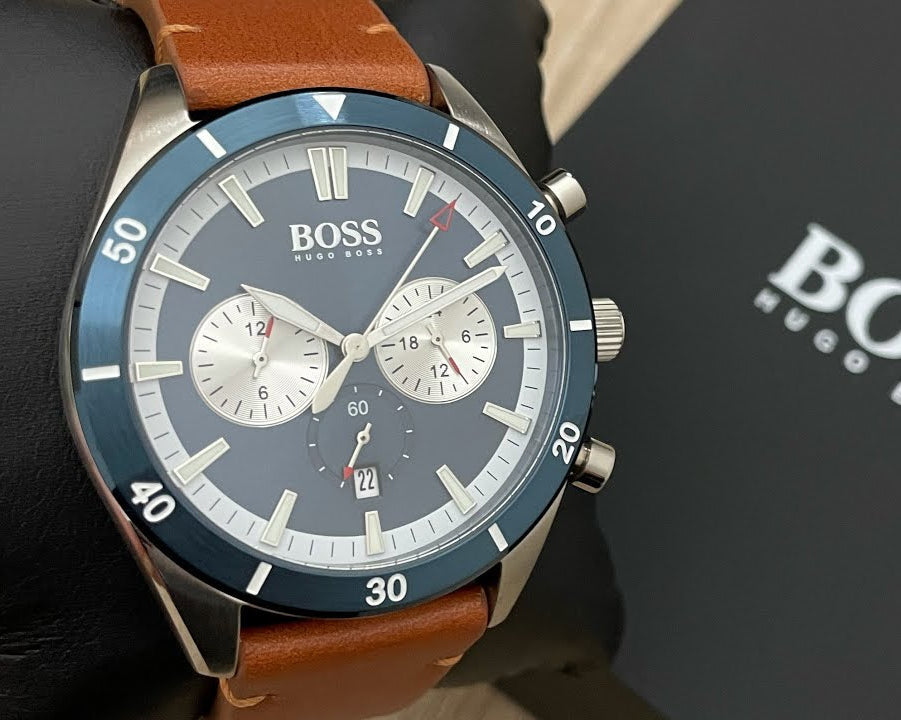 The Hugo Boss Santiago Chronograph combines timeless elegance with sophisticated functionality. Featuring a striking blue dial that captures light beautifully, this timepiece is anchored by a rich brown leather strap that develops character with wear. The chronograph subdials offer practical timing capabilities, while the refined design makes it equally at home in the boardroom or at weekend gatherings. Built with Hugo Boss's commitment to quality craftsmanship, this watch is the perfect investment for men who appreciate style without compromise. A versatile accessory that elevates any wardrobe.