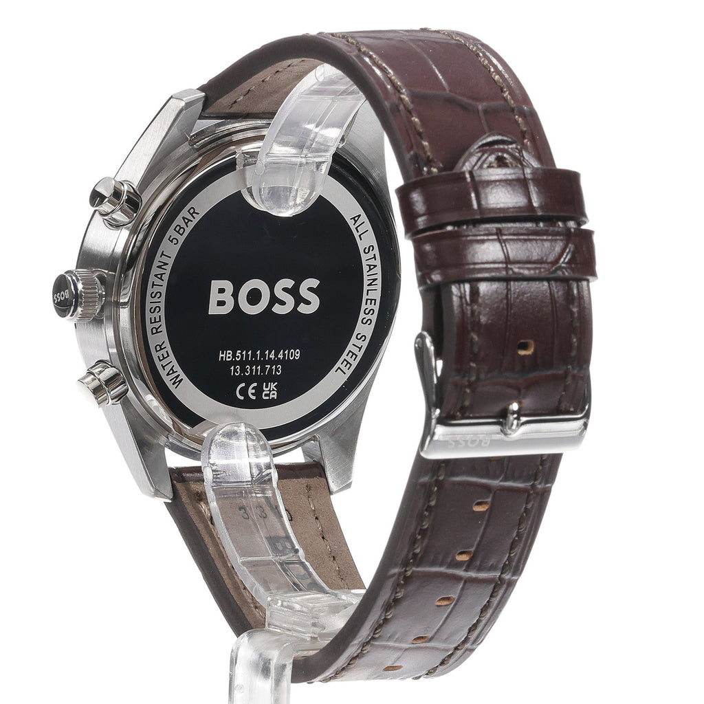 The Hugo Boss Skytraveller 1514194 Chronograph watch blends sophistication with practicality, featuring a 44mm silver stainless steel case and a rich brown leather strap. Its dark blue sunray dial with silver accents not only enhances readability but also adds a touch of elegance to its design. Powered by a precise quartz chronograph movement, it offers accurate timekeeping and stopwatch functionality. The mineral crystal protects the dial from scratches, ensuring durability and clarity.