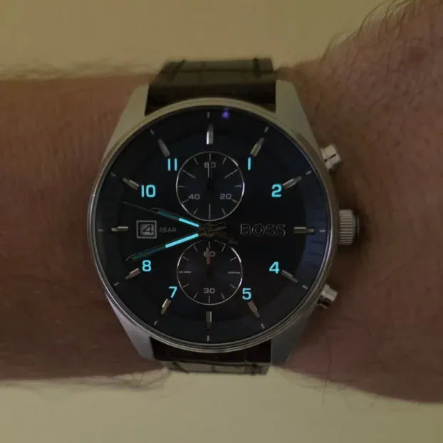 The Hugo Boss Skytraveller Chronograph combines sophisticated style with practical functionality. Featuring a striking blue dial that captures attention, this timepiece is anchored by a rich brown leather strap that exudes timeless elegance. The chronograph complication adds versatility for timing precision, whether you're tracking workouts or managing your day. Built with Hugo Boss's commitment to quality craftsmanship, this watch seamlessly transitions from boardroom to weekend adventures. Perfect for the modern man who refuses to compromise between style and substance.
