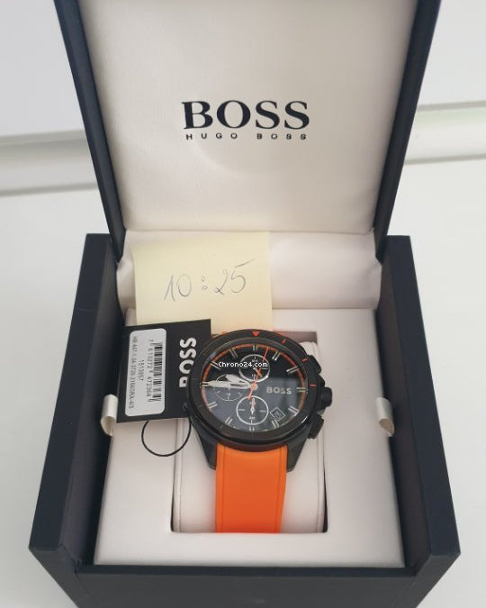 Introducing the HUGO BOSS Volane collection. Designed with the active but stylish Boss Man in mind. Recognisable for statement orange rubber strap, this colourful mens watch features a large 44mm dial showcasing fantastic, chronograph feature and orange minute marker. This addition to the collection has a stainless steel case and black bezel. The face is a stylish black featuring chronograph sub-dials and accurate date display. This lies behind a clear mineral glass. This collection houses a quartz movement for accurate time keeping. The sporty, black rubber strap is branded with the iconic HUGO BOSS logo. This mens sports watch is water resistant up to 50 metres. Every HUGO BOSS watch comes with branded presentation box and a 2 year warranty.