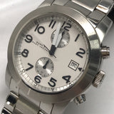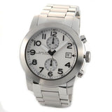 Stainless steel case with a stainless steel bracelet. Fixed stainless steel bezel. White dial with luminous hands and Arabic numeral hour markers. Minute markers around the outer rim. Dial Type: Analog. Luminescent hands and markers. Date display at the 3 o'clock position. Chronograph - two sub-dials displaying: 60 second and 60 minute. Quartz movement. Scratch resistant mineral crystal. Pull / push crown.