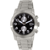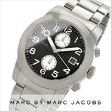 Stainless steel case with a stainless steel bracelet. Fixed stainless steel bezel. Black dial with luminous silver-tone hands and Arabic numeral hour markers. Minute markers around the outer rim. Dial Type: Analog. Luminescent hands and markers. Date display at the 3 o'clock position.Chronograph - two silver sub-dials displaying: 60 second and 60 minute. Quartz movement. Scratch resistant mineral crystal. Solid case back. Case size: 46 mm. Case thickness: 11 mm. Round case shape. Band width: 24 mm. Deployment clasp. Water resistant at 100 meters / 330 feet. Functions: chronograph, date, hour, minute, second. Casual watch style. Marc By Marc Jacobs Larry Chronograph Black Dial Men's Watch MBM5050.