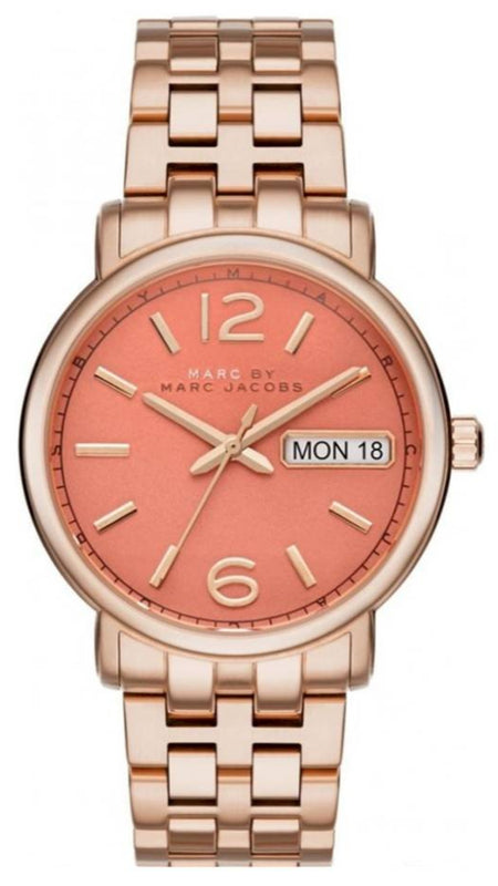 Anyone who says it's casual and elegant isn't knit. There's always a way to make it work. Lateness doesn't have to mean boring or dull and this Marc by Marc Jacobs watch is proof for those who doubt it. It's the perfect combination of surprise and down-to-earth. It features a 38mmMM stainless steel case which makes an elegant appearance right off the bat and creates a subtle contrast against the watches rose-gold dial which is perfectly pleasing to the eye The hands on the dial are rose-gold which adds to the masculine elegance of the watch. part. Elegant numerals and Arabic numerals add to its elegant feel.