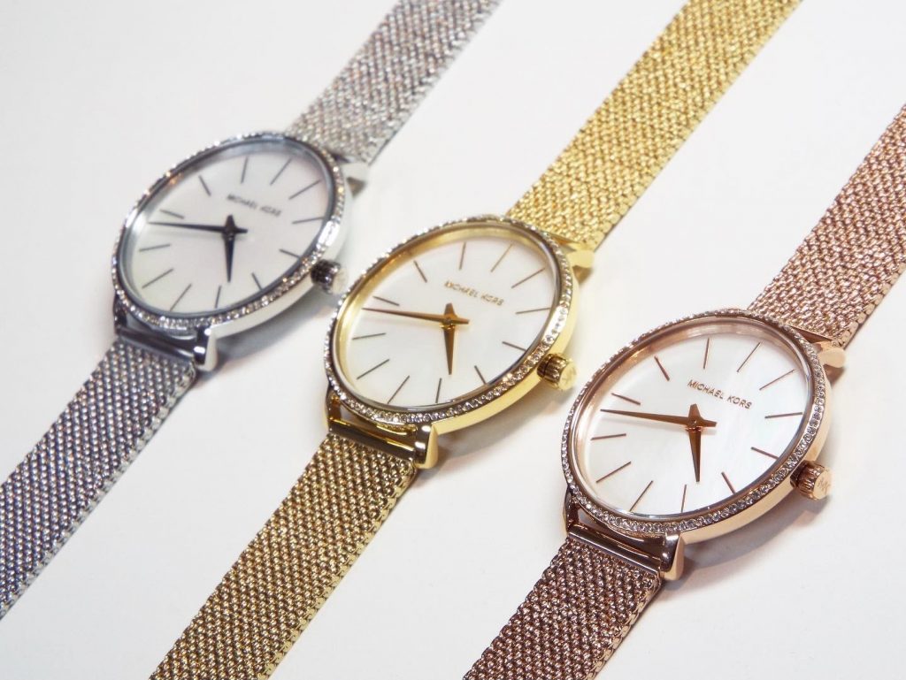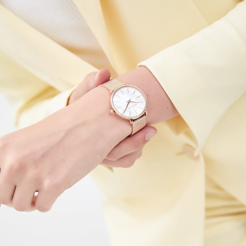 A true style statement, this voguish Rose Gold Michael Kors women’s Watch will definitely amp up your fashion quotient. Michael Kors' Pyper 32mm watch features a white mother-of-pearl dial with rose gold-tone stick indexes, rose gold-tone case with a pave topring, two-hand movement, and crystal mesh rose gold-tone stainless steel bracelet. Ace your overall look by wearing this timeless piece of accessory again and again.