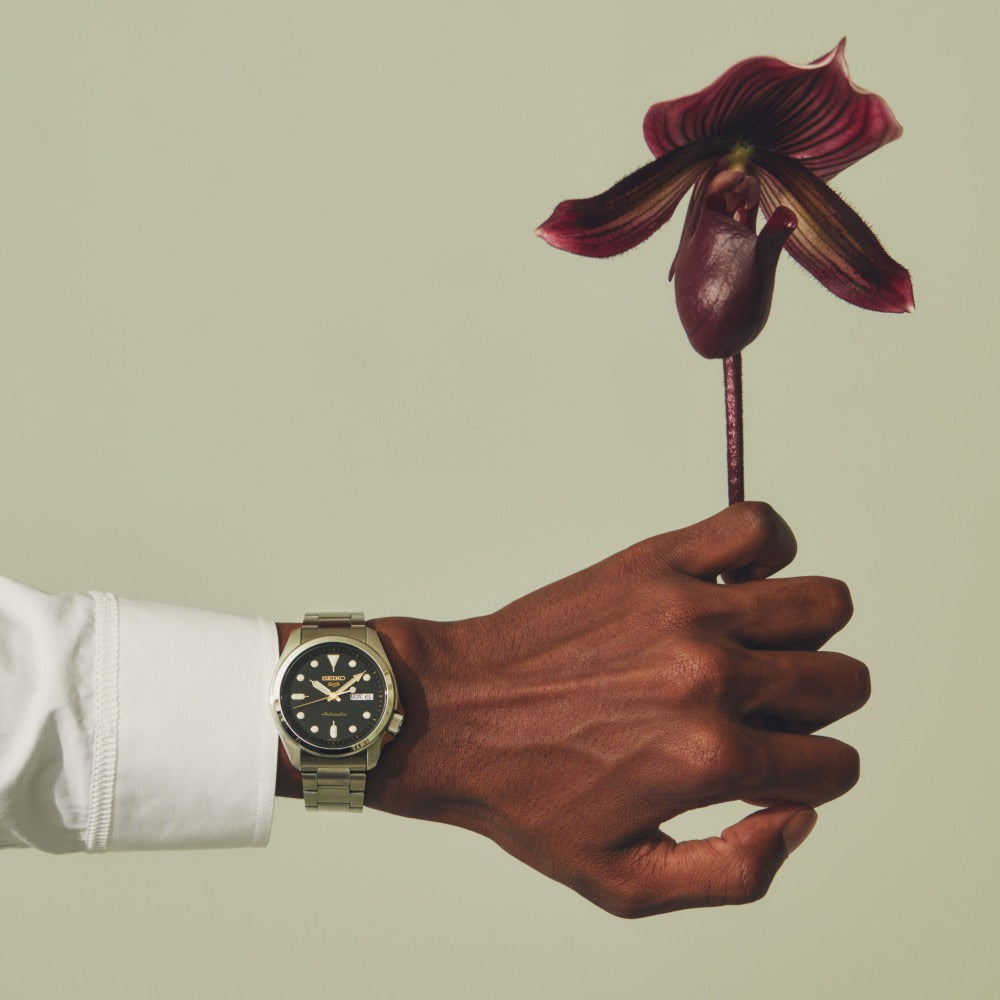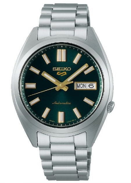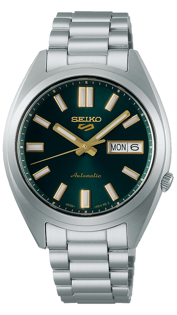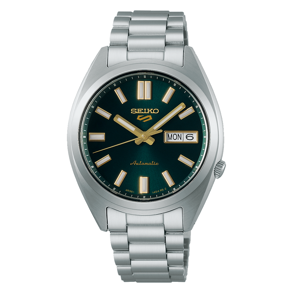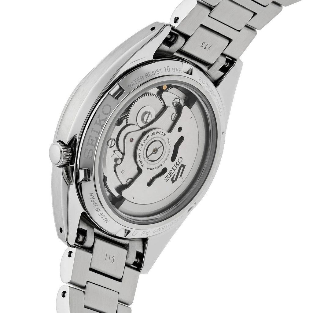 Powered by Seiko’s reliable Calibre 4R36 automatic movement with 24 jewels, this watch offers both self-winding and manual winding options, along with a 41-hour power reserve and day-date display (English/Japanese). Its matt-finished stainless steel case and bracelet, complemented by polished edges and a robust Hardlex crystal, embody durability and refined craftsmanship. Water-resistant up to 10 bar (100 metres), the Seiko 5 Sports SNXS effortlessly balances heritage styling with modern functionality — a perfect everyday companion for the man of style and substance.