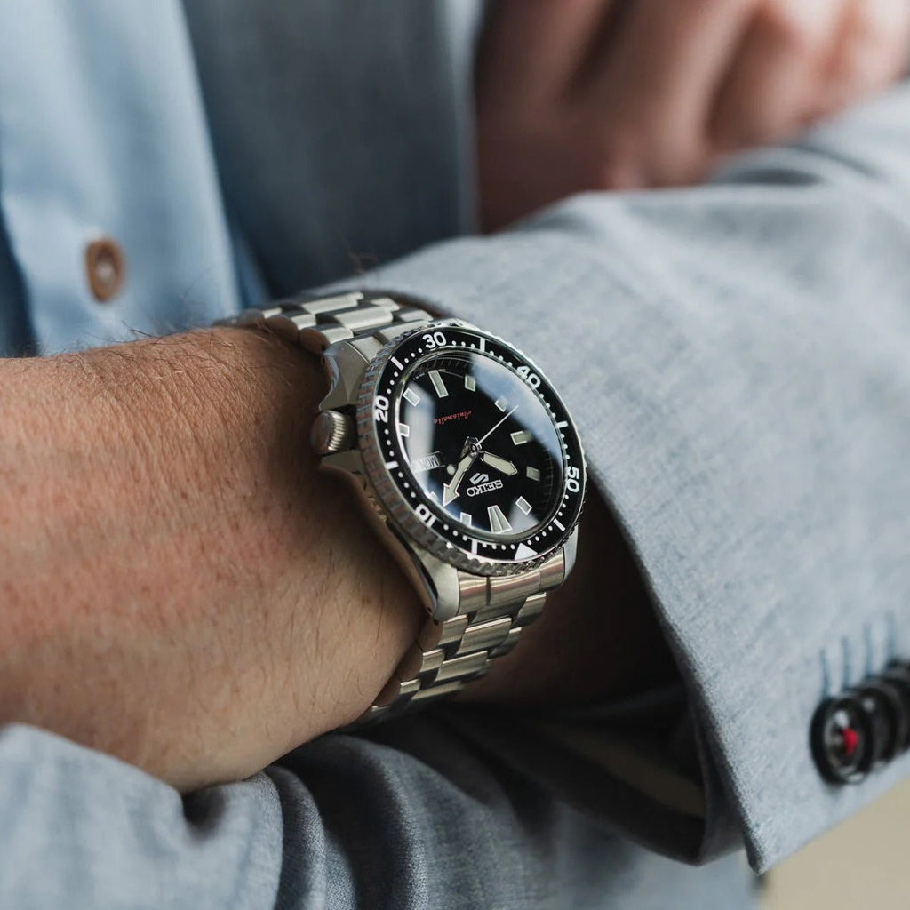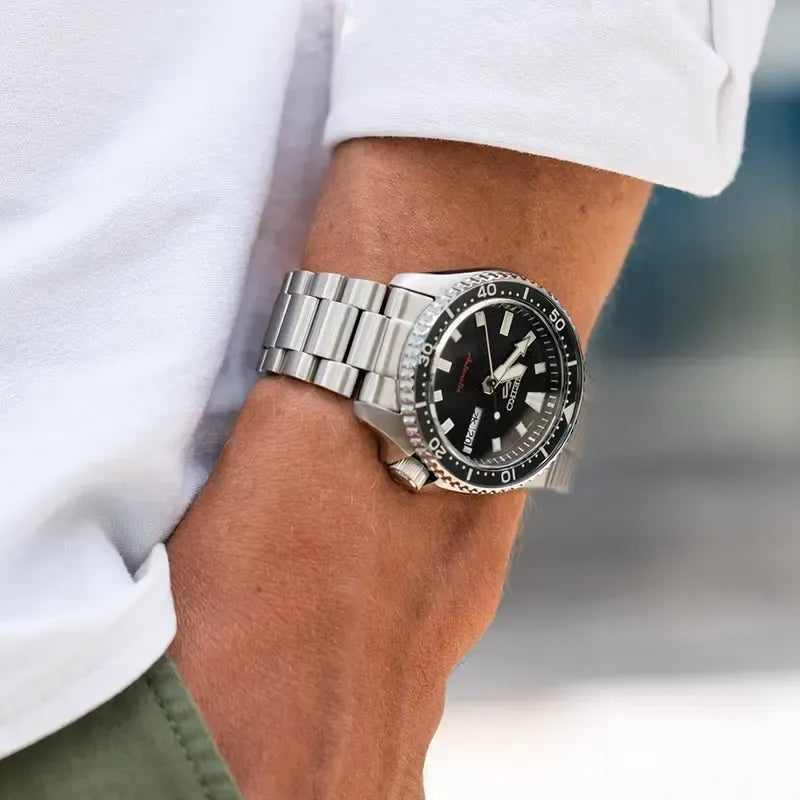 The newest release in the Seiko 5 Sports lineup pays homage to the revered SKX399, a standout from 1998. This automatic diver-style timepiece blends vintage inspiration with modern refinement. Its dial showcases a sunray finish and elevated hour markers, complemented by hands that echo the original SKX design with a fresh twist. A retro-style glossy insert enhances the bezel’s nostalgic charm, while the bracelet—now reimagined with rounded links—adds a touch of sophistication to the overall silhouette.