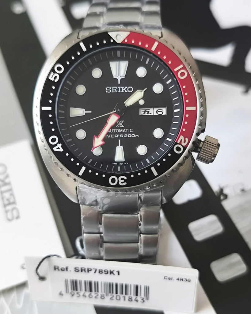 Seiko Prospex Turtle Automatic Diver's 200M SRP789K1 Gents Watch. Stainless steel case. Seiko Stainless Steel Full Solid Bracelet. Japan Made Automatic movement. Engraved Screw Case Back. BLACK dial with SUPER LUMINOUS markers. Day & Date calendar display at 3 o'clock position. Hardlex Crystal Glass. Water resistant to 200 meters. Approximate case diameter: 45mm, approximate case thickness: 13.4mm