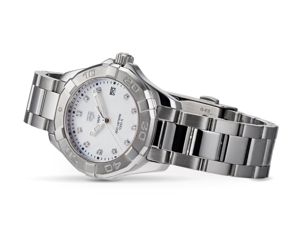 Allowing you to keep track of time in style, this TAG Heuer Aquaracer timepiece features a striking mother-of-pearl dial equipped with sparkling diamond dot hour markers, a date display window at 3 o’clock, and luminous hands for optimum visibility all conditions.