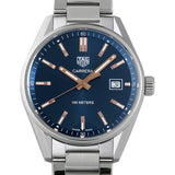 Authentic Tag Heuer Carrera Quartz Blue Dial 39mm Steel Women's Dress Watch Model WAR1112.BA0601-SD. Stainless Steel Polished case with Silver Stainless Steel Brushed and Polished watch band. Deployment with Push Button and Foldover clasp. Fixed bezel. Dial description: Rose gold luminous hands and Index hour markers with minute markers around the outer rim on a Blue dial. Swiss Quartz movement. Watch functions: Date, Hour, Minute, Second. Screw in crown. Scratch Resistant Sapphire crystal. Round case shape. Case size: 39mm. Solid case back. 100 Meters - 330 Feet water resistant. 1 year warranty.