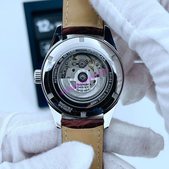 Brand New Authentic Tag Heuer Carrera Calibre 5 Day-Date Automatic Silver Dial Crocodile Strap Men's Watch Model WAR201B.FC6291. Polished Stainless Steel case with Brown Alligator Leather strap. Deployment clasp. Dial description: Silver with Day-Date at 3 dial. Silver dial. Automatic Self Winding Winding Calibre 5 with Approx. 38Hr. Power Reserve movement. Winding crown. Scratch Resistant Sapphire crystal. Case size: 41mm. Transparent case back. 100 Meters/330 Feet water resistant. 2 year warranty. Also known as model: WAR201BFC6291, WAR201B-FC6291.