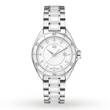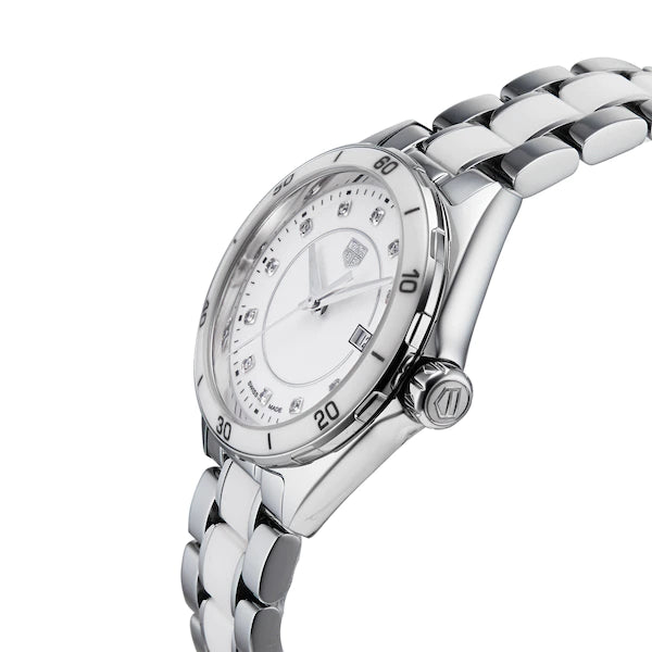Instantly noticeable, the striking white dial of this TAG Heuer Formula 1 Ladies watch is decorated with the brand’s famous logo at 12 o clock, diamond dot indices and sleek steel hands. The neatly sized 32mm fine brushed and polished stainless steel case is water resistant to 100 metres and moulds elegantly to the wrist thanks to the sleek lugs and sophisticated two toned white ceramic and stainless steel bracelet.